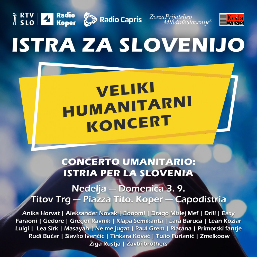 Istrski glasbeniki so se povezali, da bi pomagali rojakom na prizadetih območjih. Veliki humanitarni koncert ISTRA ZA SLOVENIJO se bo zgodil v nedeljo 3. septembra ob 19. uri na Titovem trgu v Kopru. Koncert bosta prenašala Radio Koper in Radio Capris.