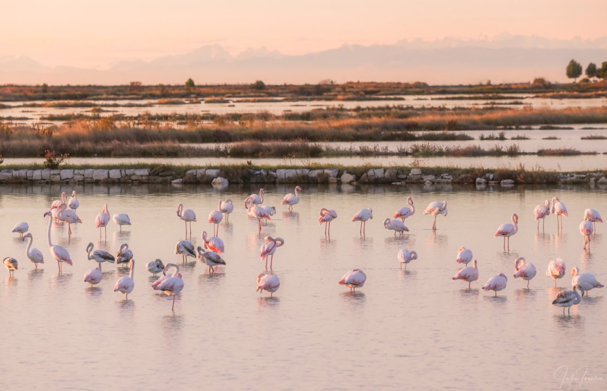 Med fotografijami je tudi ena iz najnovejše serije Ivančičevih posnetkov – plamenci v Krajinskem parku Sečoveljske soline, kjer prezimuje rekordnih približno 350 plamencev.