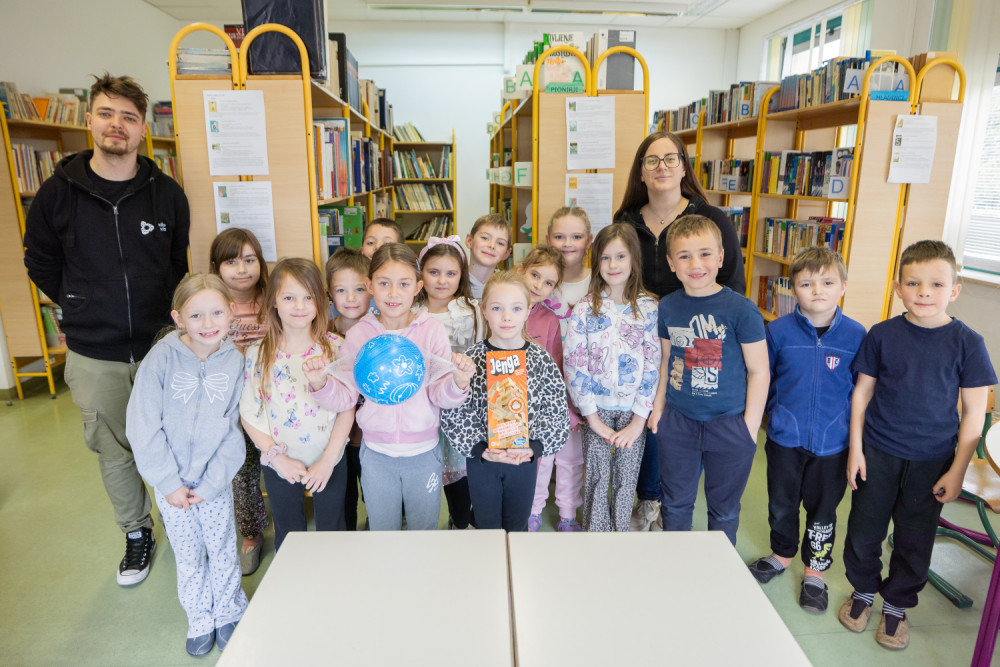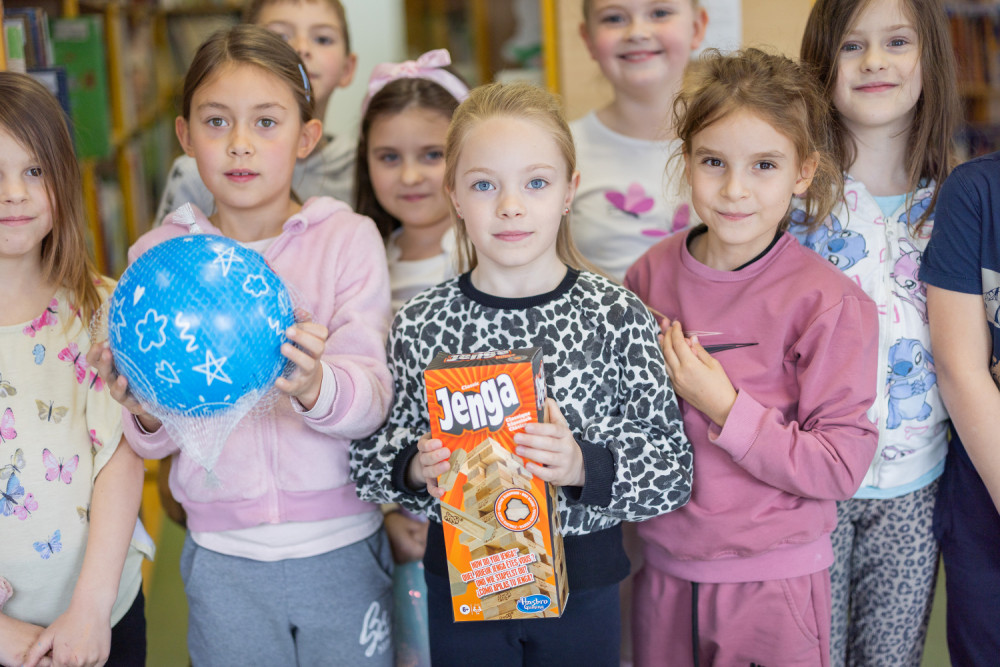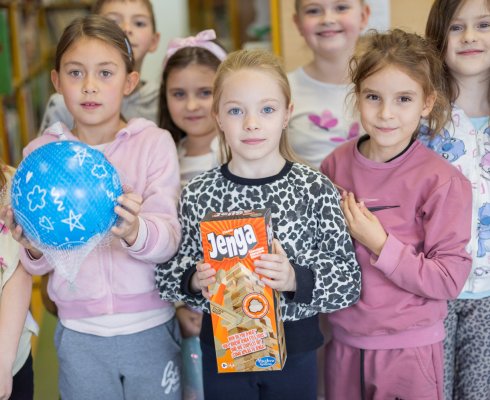 Drugošolce so razveselili z leseno igračo Jenga, ki spodbuja razvoj fine motorike, razvoj senzoričnih sposobnosti, kognitivni in socialni razvoj ter žogo, s katero bodo urili svojo fizično pripravljenost.
